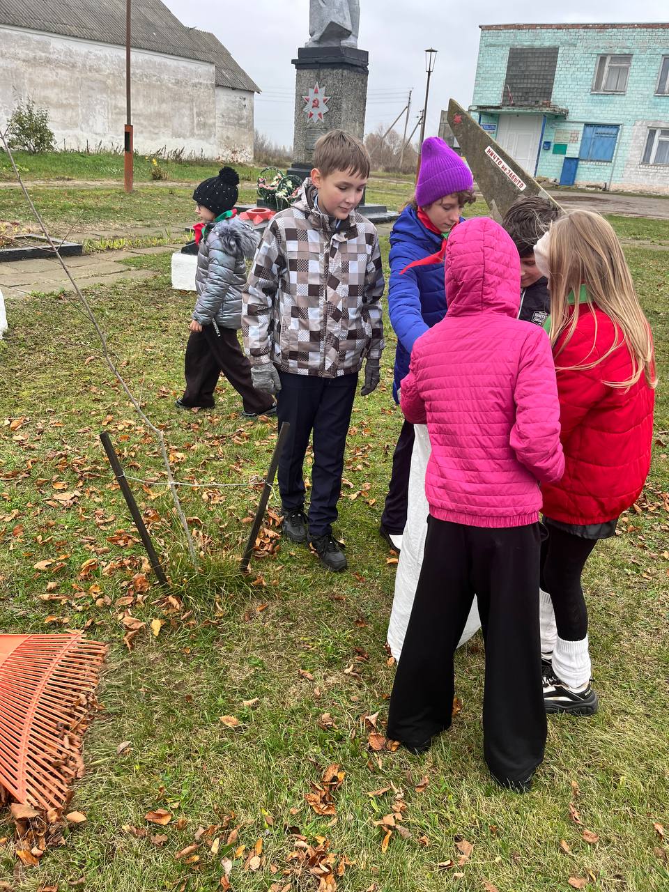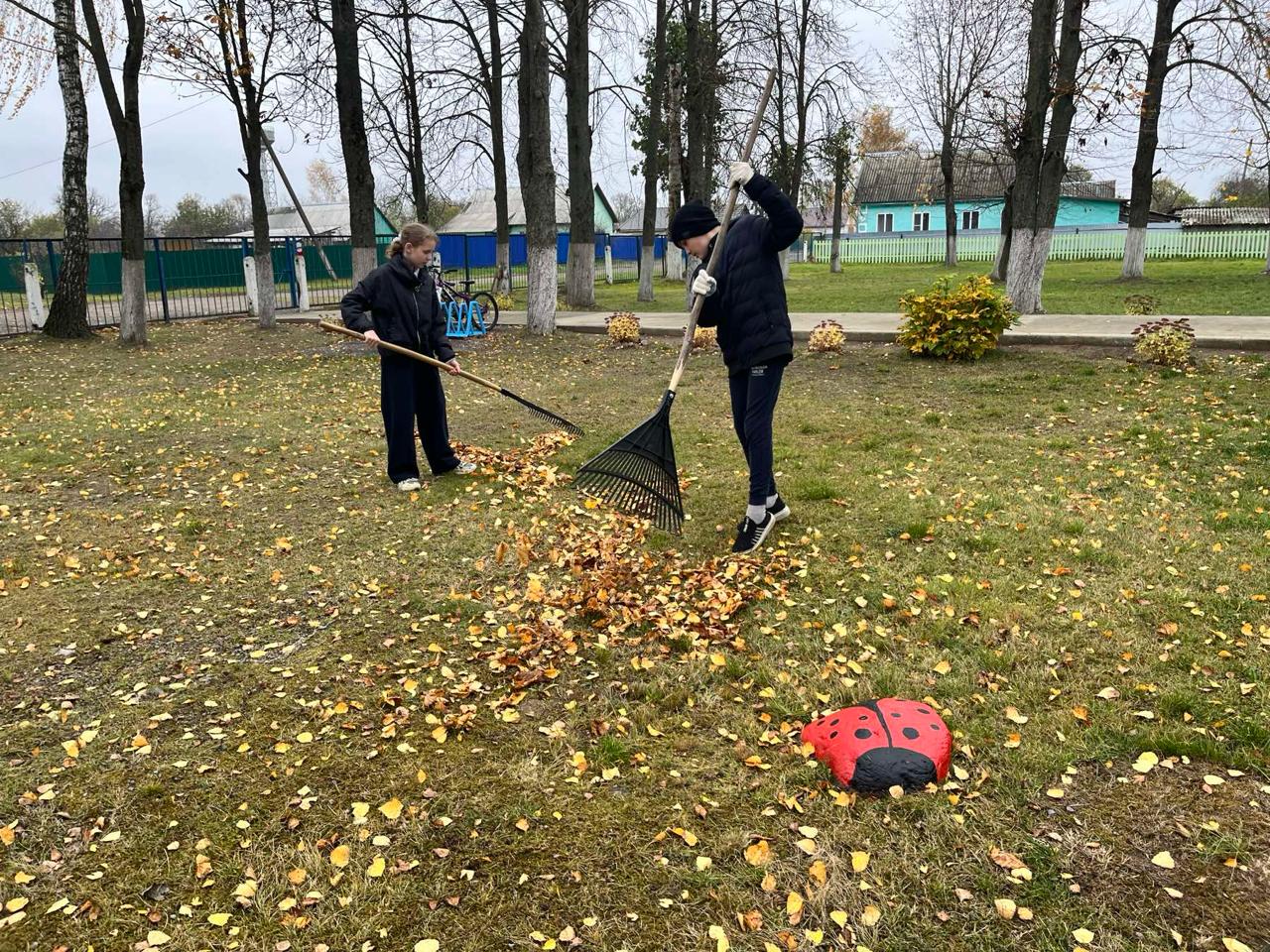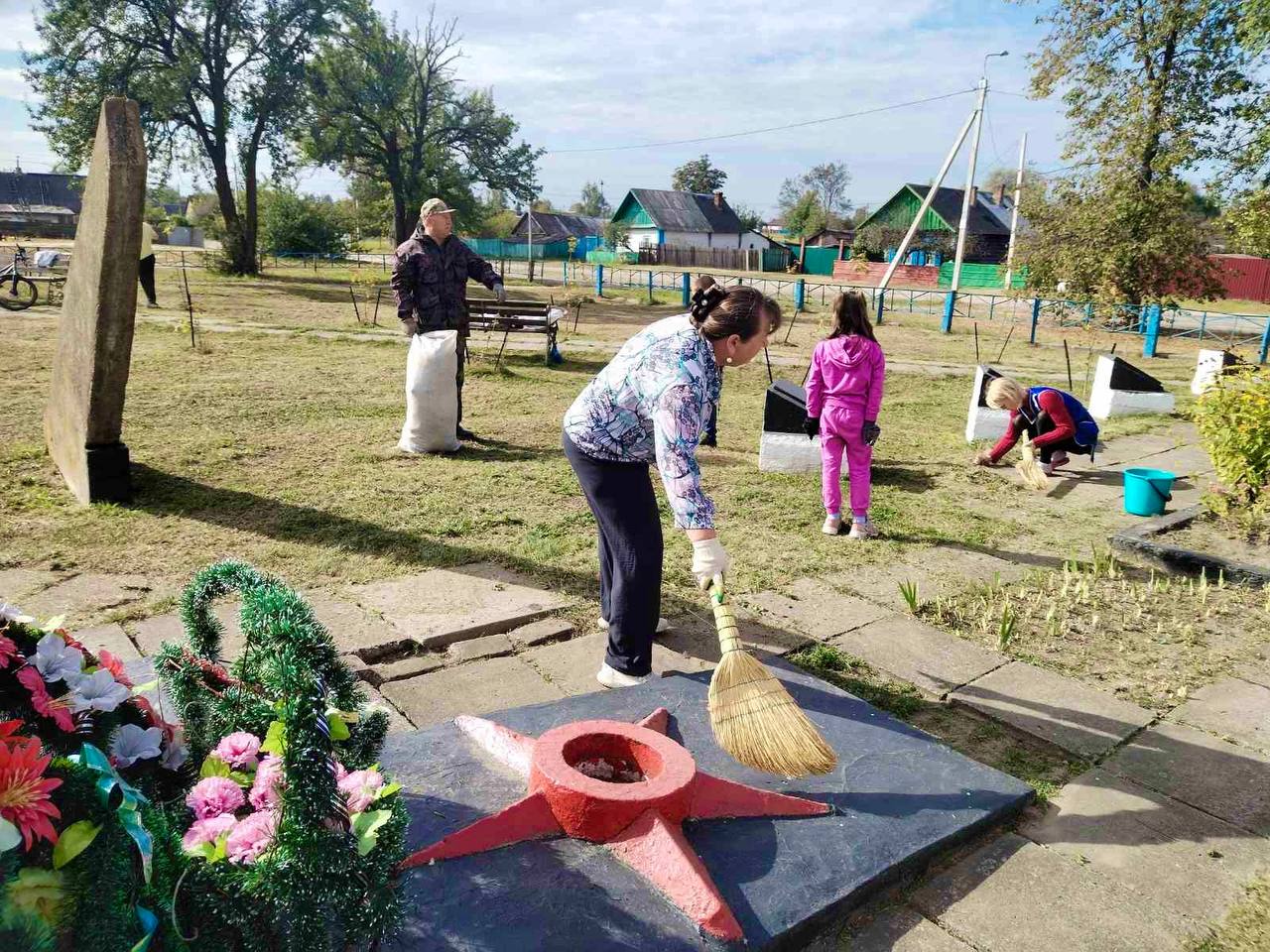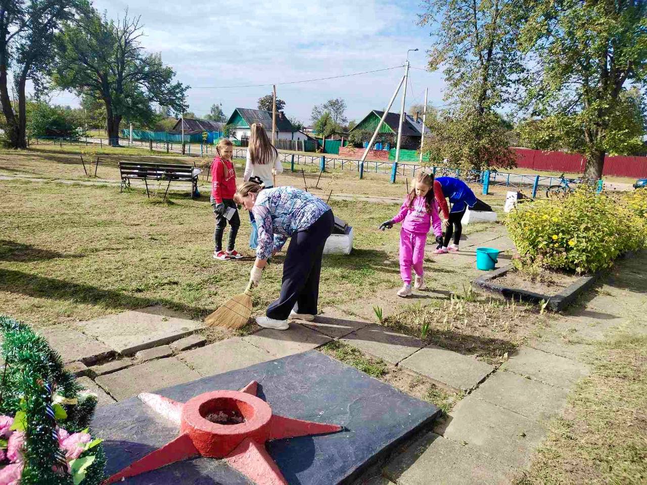 В новом учебном году это первая трудовая акция. Все участники привели в порядок не только территорию школы, но и территорию возле памятника погибшим землякам в деревне Проскурни.